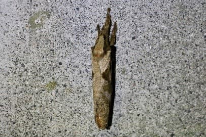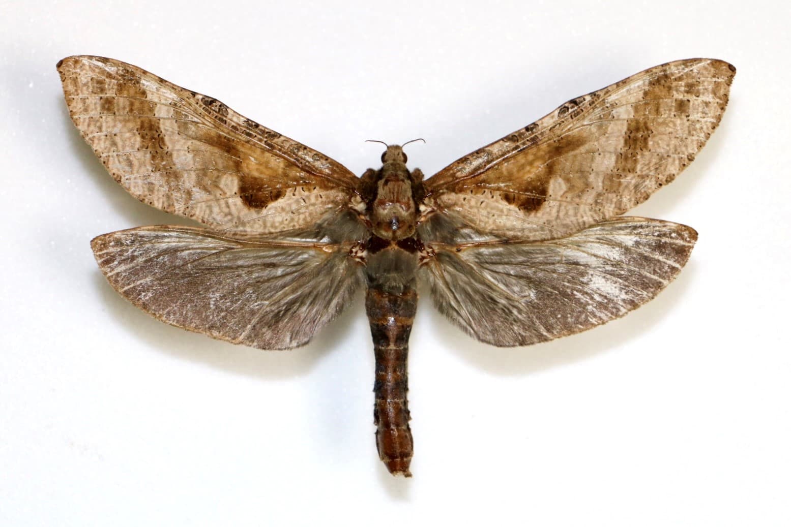 今回とりあげるコウモリガEndoclyta excrescens(Butler)(写真1,2)は,コウモリガ科というグループに属する種で,国内に広く分布する。体長(胴体の長さ)が50~60 mm,開張(翅を広げた大きさ)は100 mm前後とかなりの大型で,丸太のように寸胴な体形と細長い翅,太く発達した中脚と前脚をそなえた非常に特徴的な姿をしている。翅よりも胴体や脚が目立つ風貌という点で,他のガとは異なった見た目の印象をもつかもしれない。