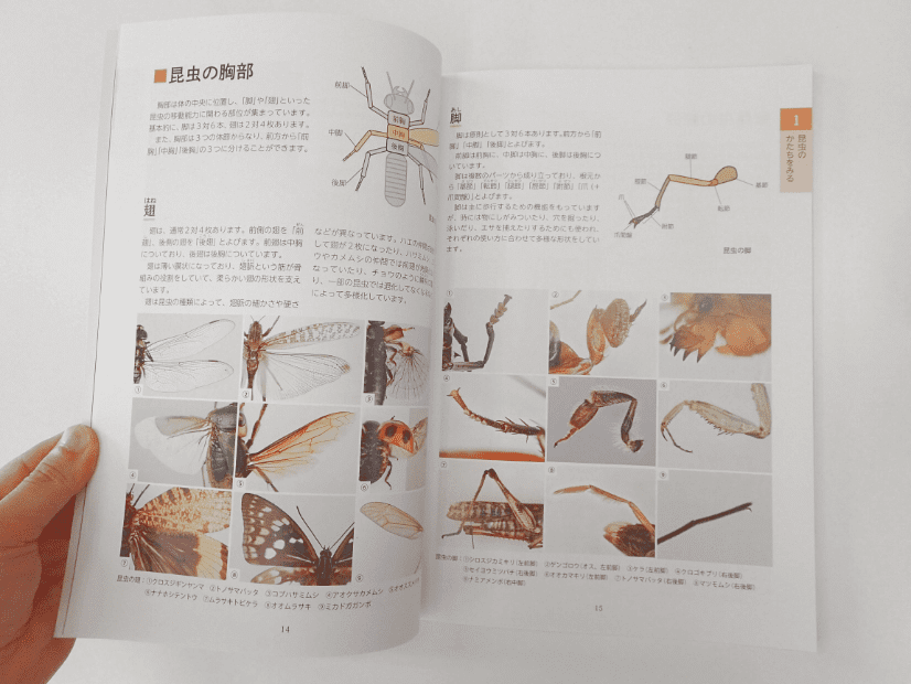 本書は、「昆虫図鑑を使う前」に一読していただきたい一冊であり、同定する上で必要となる「昆虫の体の構造」や「その特徴」がわかりやすく解説されている。例えば、図鑑や専門書の解説に登場する体パーツがどの部分を指すのか、それがどういった形や構造なのかを「視覚的」に把握できるので、初学者でも取っつきやすい。「視覚的に」と書いたとおり、多くの図や写真が使われていることが、理解の助けとなる。